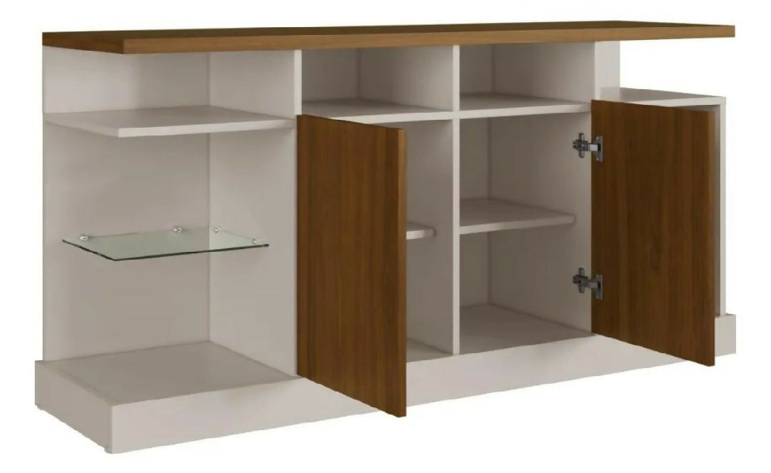 Possui 2 portas com prateleiras internas, adega embutida para acomodar suas garrafas de vinho preferidas com requinte, além de prateleira de vidro elegante, ideal para suas taças.